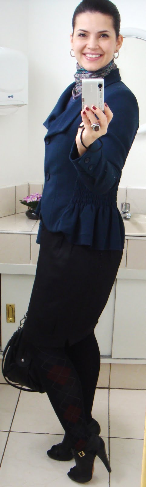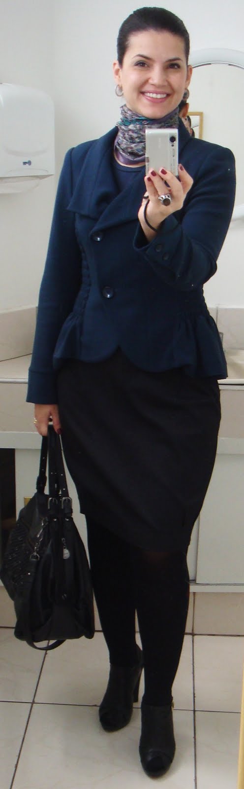 No look de hj fiz uma combinação que quase não uso, azul marinho com preto e acho que ficou bem chique!!!não reparem na cara de gripe, estou melhorando!!!