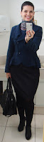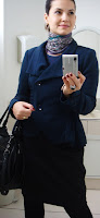 *escolhi um casado azul marinho de lã que é bem acinturado e deu uma boa proporção com a saia mais reta
