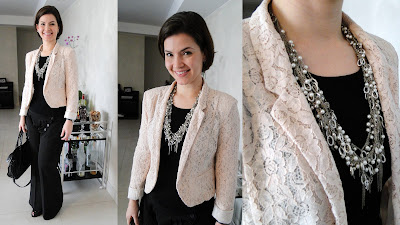 Bolero lindíssimo de renda, que ficou perfeito com a saruel, que deu uma atualizada e uma modernizada no look. Gosto muito de renda, está super na moda, mas temos que ter cuidado com as peças que combinamos, pois renda em geral dá uma envelhecida. Sempre procuro combinar com peças mais modernas para atualizar o look.