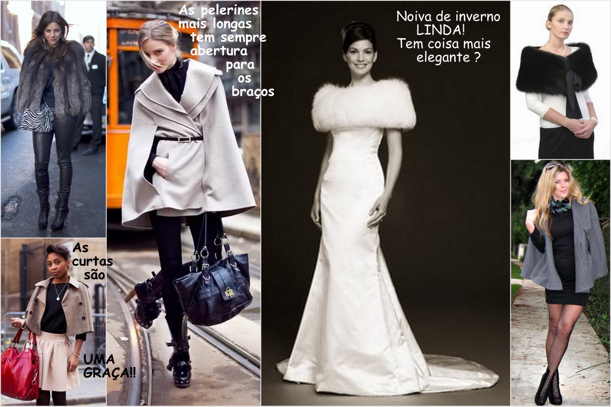 Pelerine: espécie de capa curta ou comprida, com algum tipo de abotoamento ou aberta na frente, onde os braços ficam livres. Pode ser de pele ou de lã.