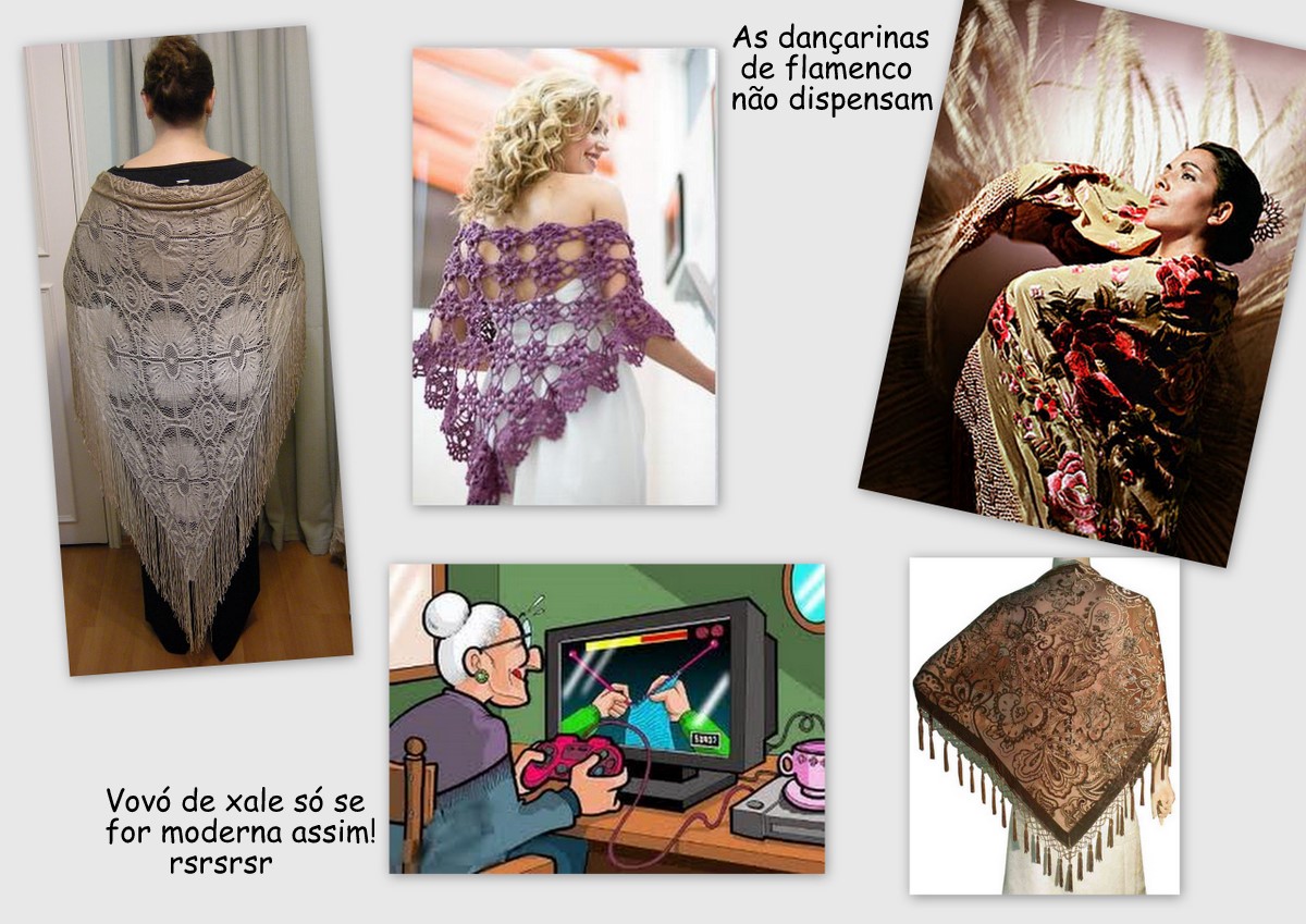 Xale: de formato triangular são grande o suficiente para cobrir os ombros. Podem ser de materiais variados como lã, linha, algodão ou seda. Muitas vezes são bordados. Eu acho-os perigosos, principalmente os de tricô ou crochê, pois podem envelhecer o look dando uma “cara” de xale da vovó.