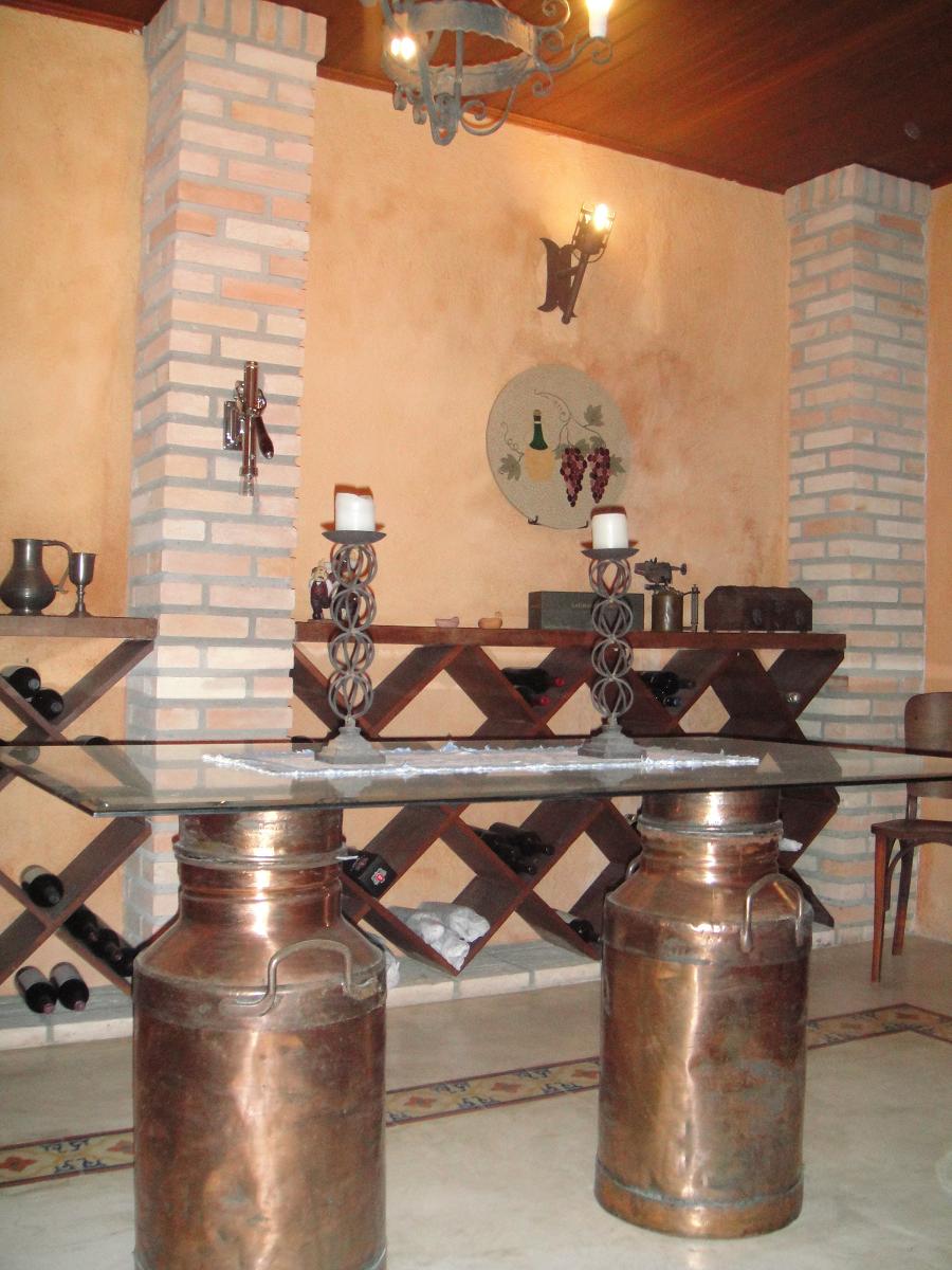 Arte em ferro...Os latões de leite antigos, banhados de cobre, viraram os pés de uma mesa.