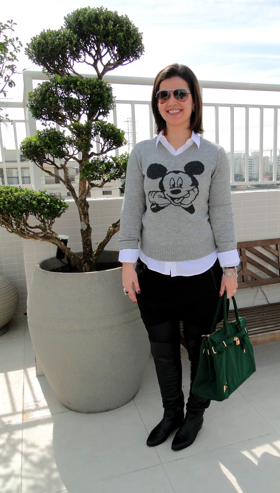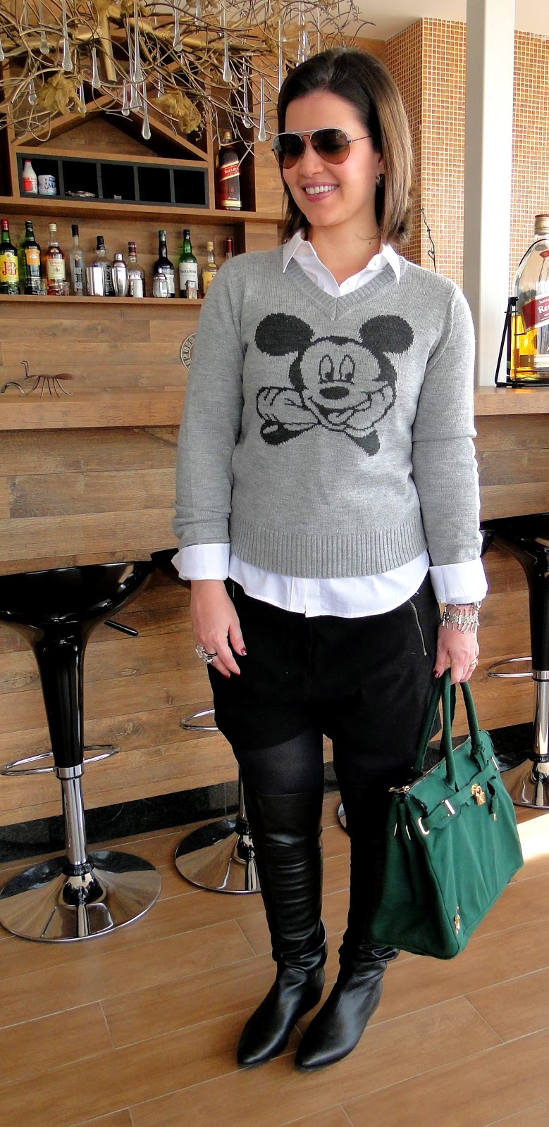 shorts de alfaiataria preto, camisa branca e suéter cinza com o Mickey para alegrar! E usei minhas botas de canos extra longos, na teoria essas botas passam uma imagem sexy, mas meu modelo é sem salto e eu sempre procuro usar com peças mais casuais, assim ela apenas deu charme ao look, sem pesar o visual!