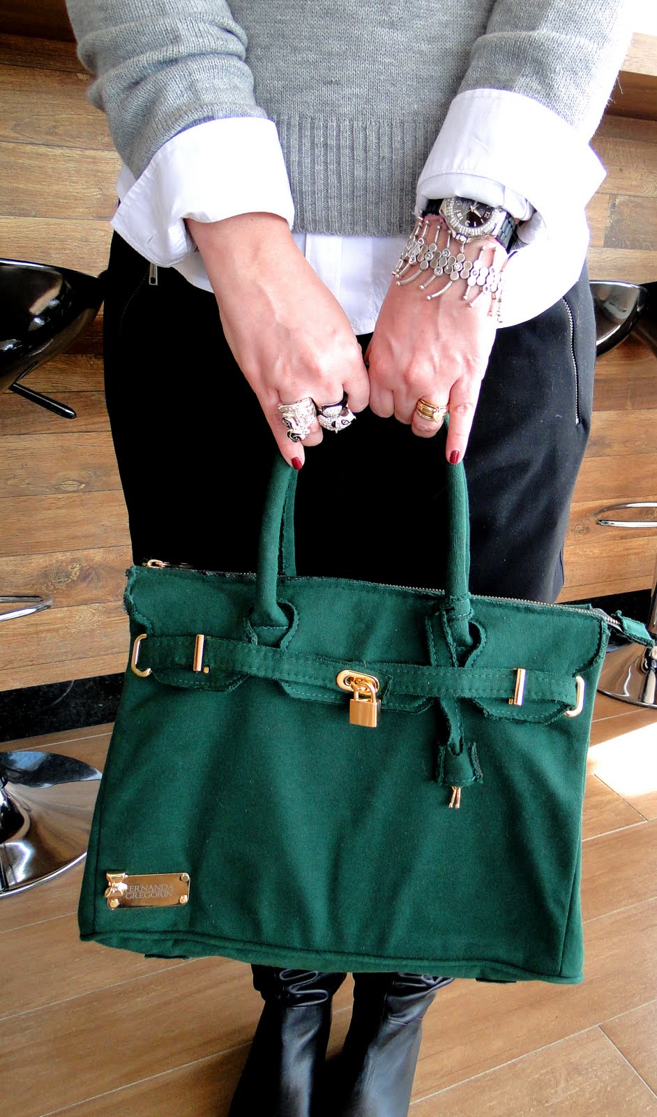 detalhes que vcs amam, acessórios em prata e bolsa verde em moletom para dar cor ao look!