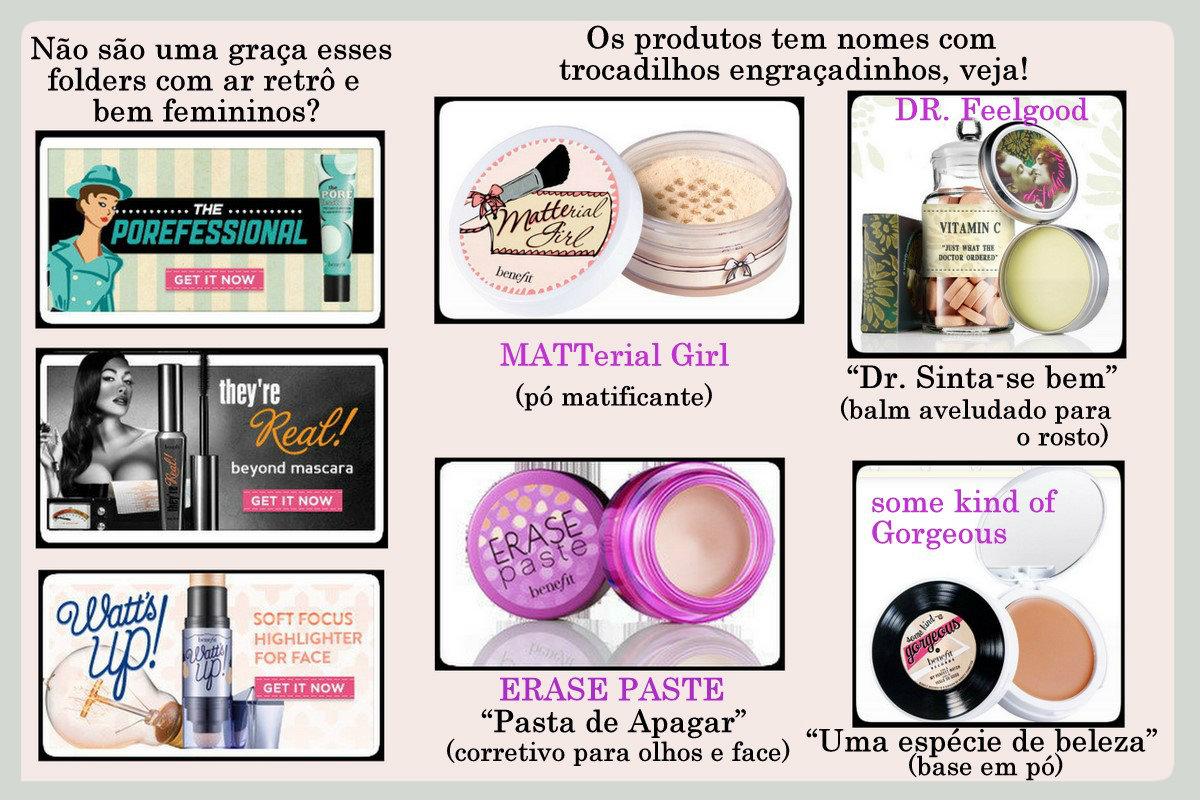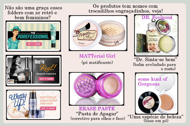 Então gostei de conhecer um pouco dos produtos da Benefit, gostei das embalagens dessa marca, em especial de seu ar retrô e de seu visual bem feminino, e mais ainda das brincadeiras feitas com os nomes, rs... Bacana mesmo!