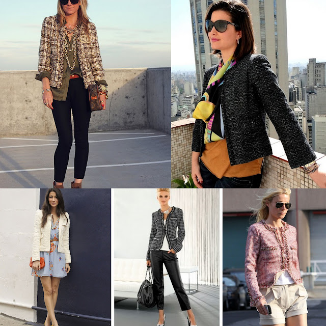 O casaqueto de tweed é um clássico e pode compor looks comportados e sérios, com saias e scarpins, mas também descontraídos, com jeans, calças de couro e shorts, acho que o segredo é brincar com os acessórios, com as composições, se você usá-lo com um colar de pérolas ele sempre fica mais clássico, mas se usá-lo com correntes mais grossas, acessórios mais pesados, ele fica mais jovial, é só escolher o seu estilo, olhem alguns exemplos...