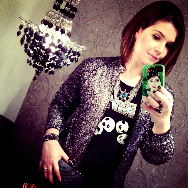 Uma pena que fotos noturnas nunca ficam boas, a luz de casa não ajuda e com flash ficam horríveis rsrsrs. Mas acho que dá para ter uma idéia do look , na verdade nada de mais. Calça preta, t-shirt, mas caprichei no brilho e mesmo com uma jaqueta de paetês arrisquei no colar e no final acho que o look ficou "muderninho" rsrsrs