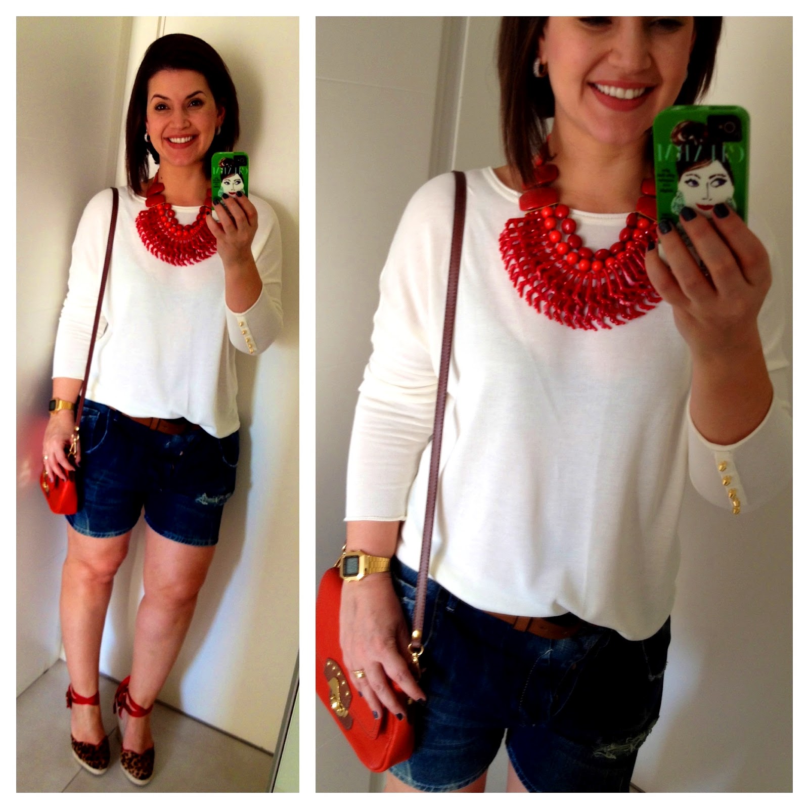 Tricot fino, bermuda jeans, espadrille de onça, maxicolar, tudo #ousemuitoamo