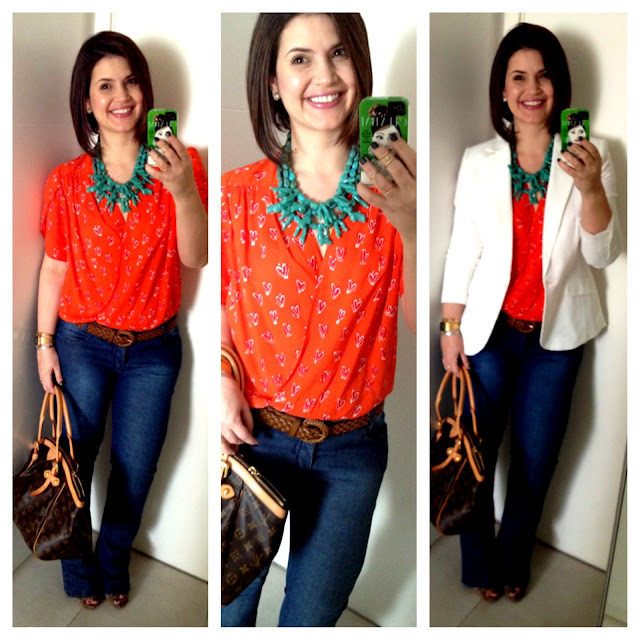 jeans HERING/ body coral e blazer ANDREA MARQUES para C&A/ colar ALEXANDRA TOPAL/ cinto H&M/ bolsa LV/ anéis PROVENCE