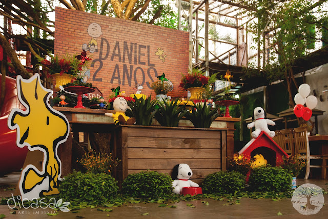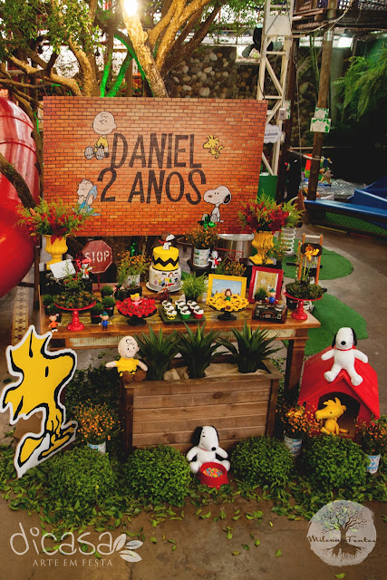 O Snoopy e seu amigo Woodstock e, essas latas com flores, eram as latas de leite do Daniel vazias, o Alex as encapou com tiras em quadrinhos e elas foram espalhadas pelo buffet, todo mundo amou a ideia e ainda levaram para casa!